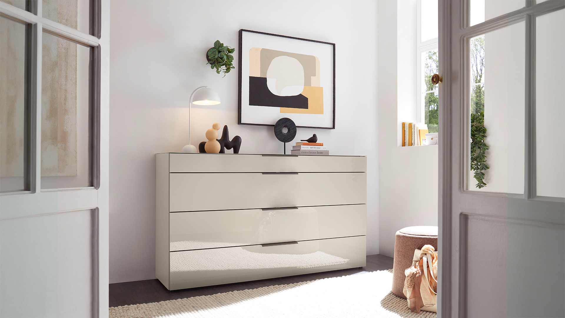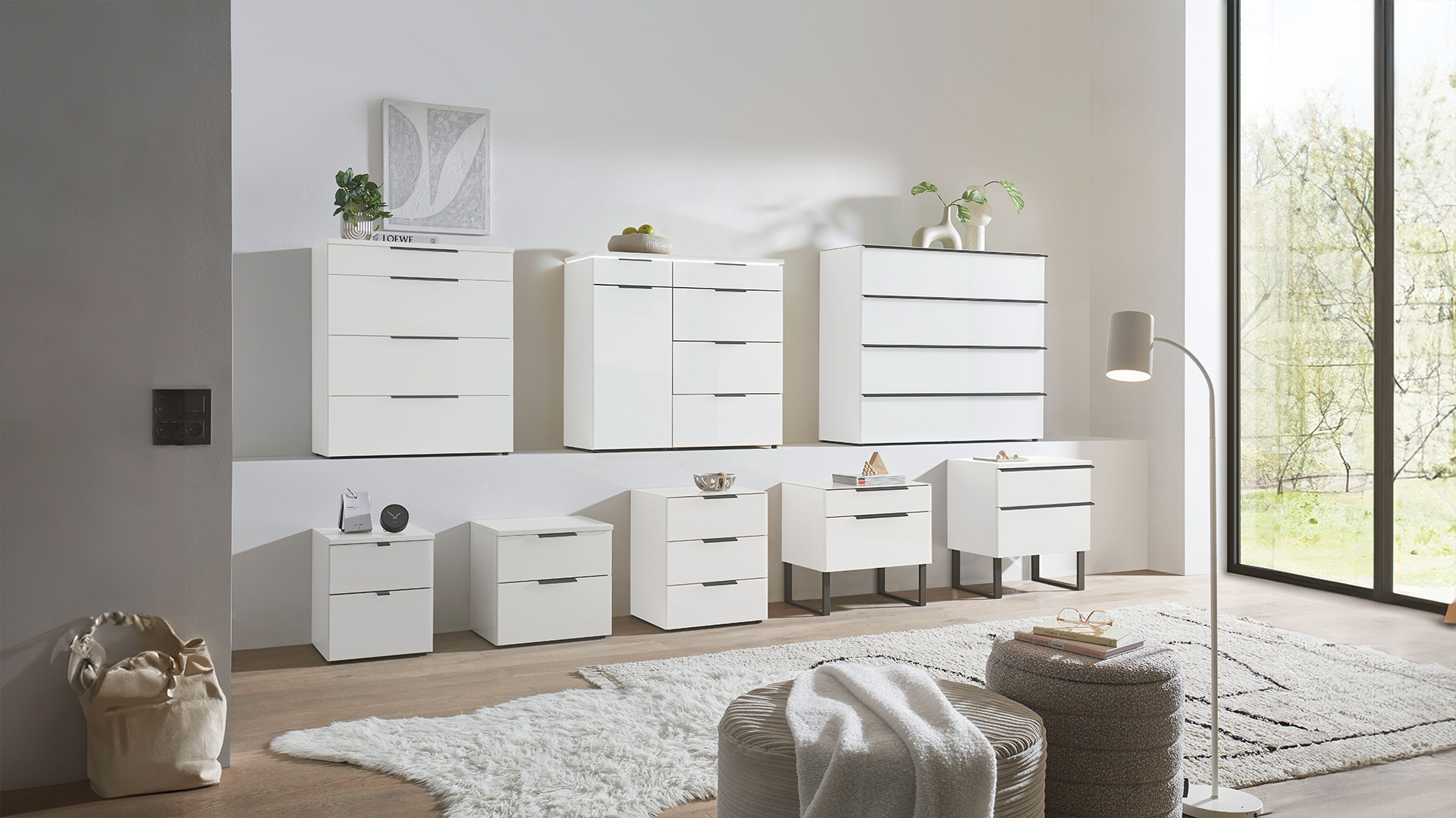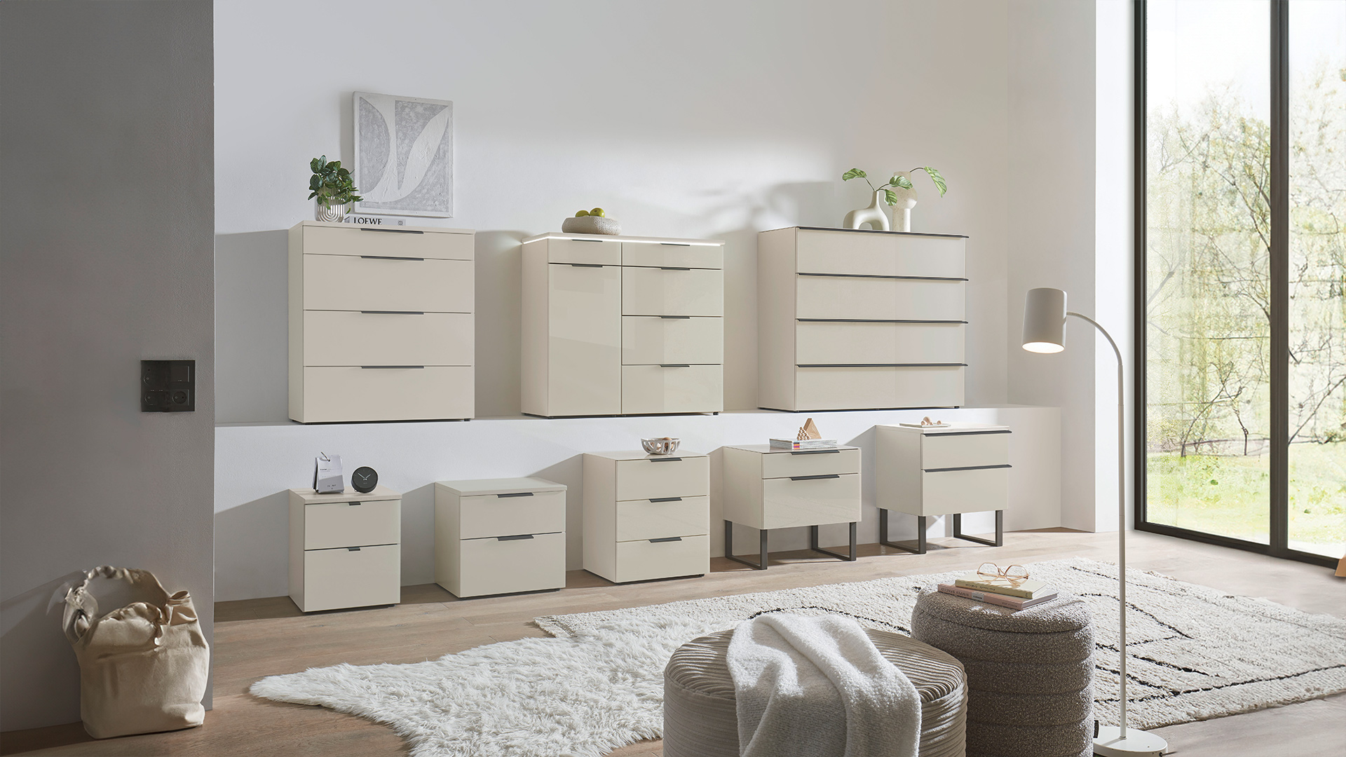 The COMO chests of drawers and bedside cabinets are available in a variety of designs: bedside cabinets in widths of 40 to 60 cm and six different heights with one to three pull-outs. Chests of drawers in widths from 40 cm to 180 cm and heights from 78.4 cm to 104 cm, available with three to eight pull-outs and optionally with doors. You can choose between five carcase colours in modern decor and eight different front designs, including elegant glass fronts. Height-adjustable gliding feet are also included to ensure stable alignment on any surface.