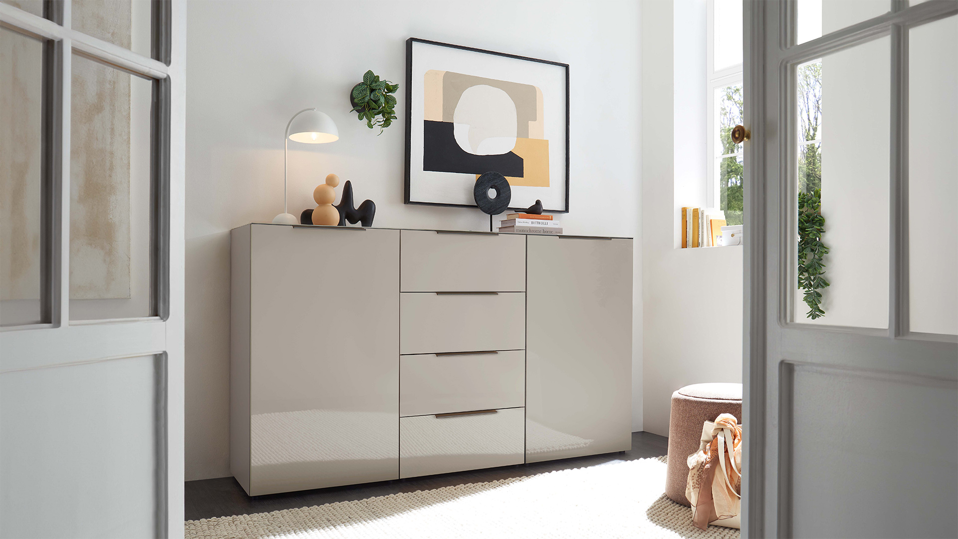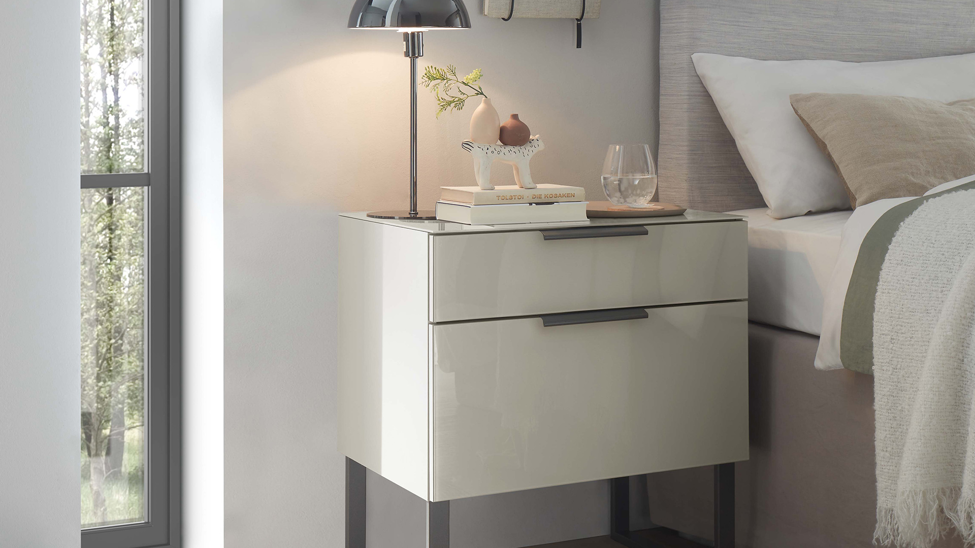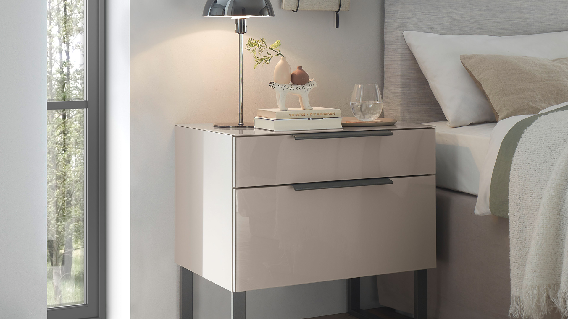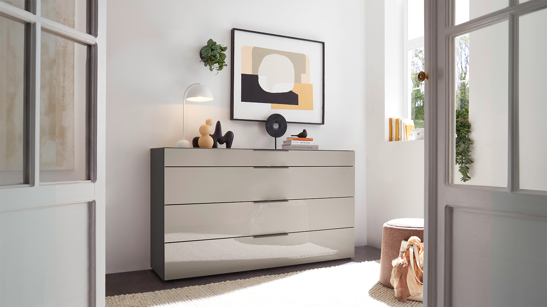 The COMO chests of drawers and bedside cabinets are available in a variety of designs: bedside cabinets in widths of 40 to 60 cm and six different heights with one to three pull-outs. Chests of drawers in widths from 40 cm to 180 cm and heights from 78.4 cm to 104 cm, available with three to eight pull-outs and optionally with doors. You can choose between five carcase colours in modern decor and eight different front designs, including elegant glass fronts. Height-adjustable gliding feet are also included to ensure stable alignment on any surface.