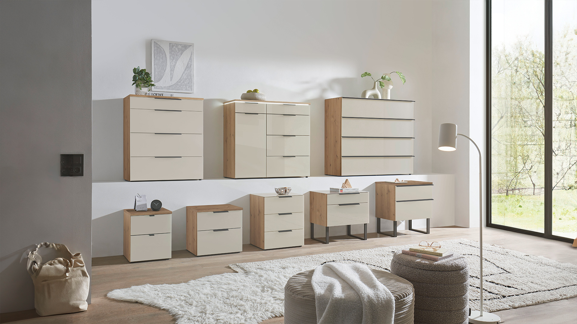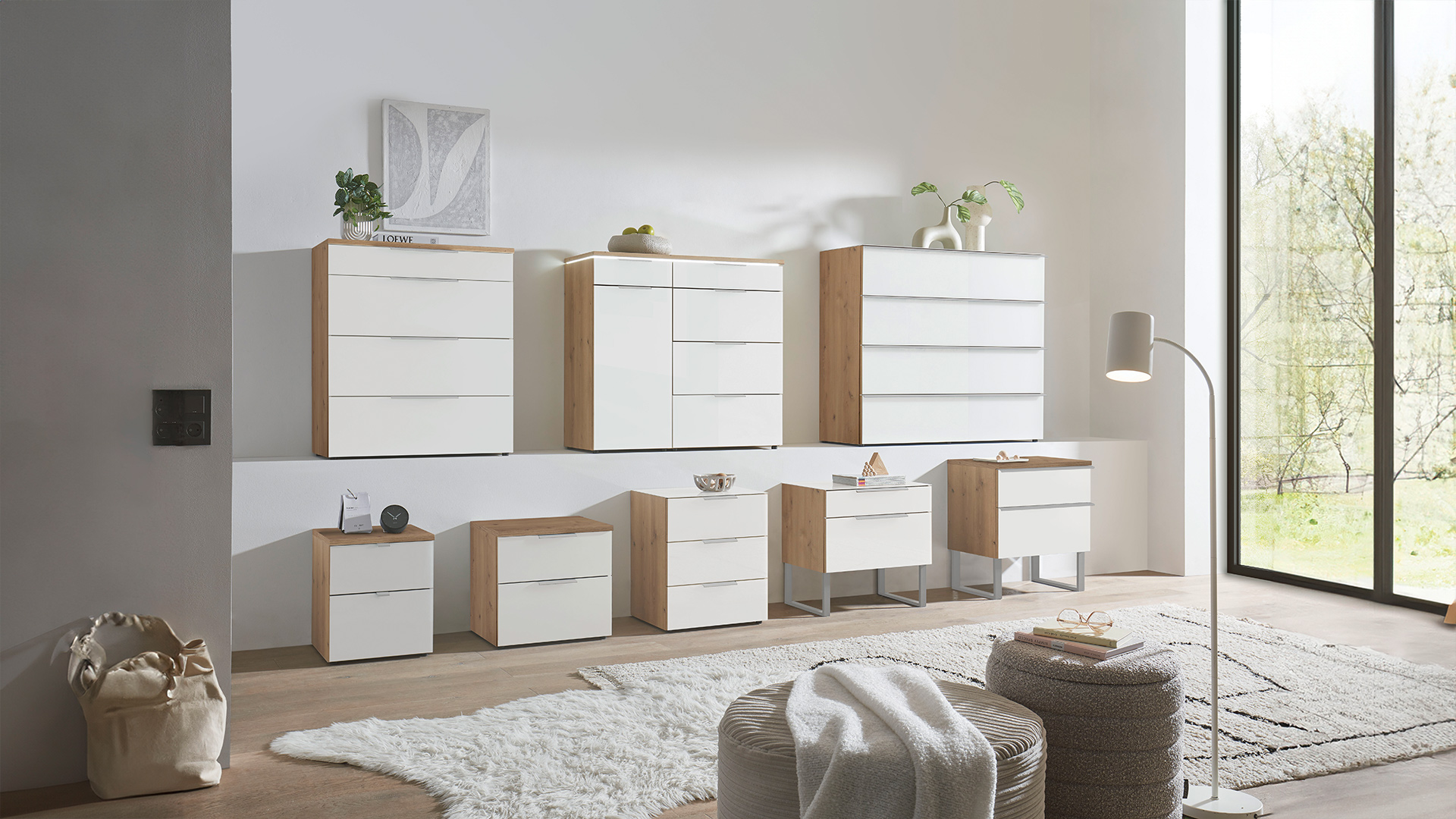 The COMO model offers you a wide selection of chests of drawers and bedside cabinets that impress with their clear design language and high-quality materials. Thanks to the flexible combination options, the furniture adapts perfectly to your individual room and design requirements.