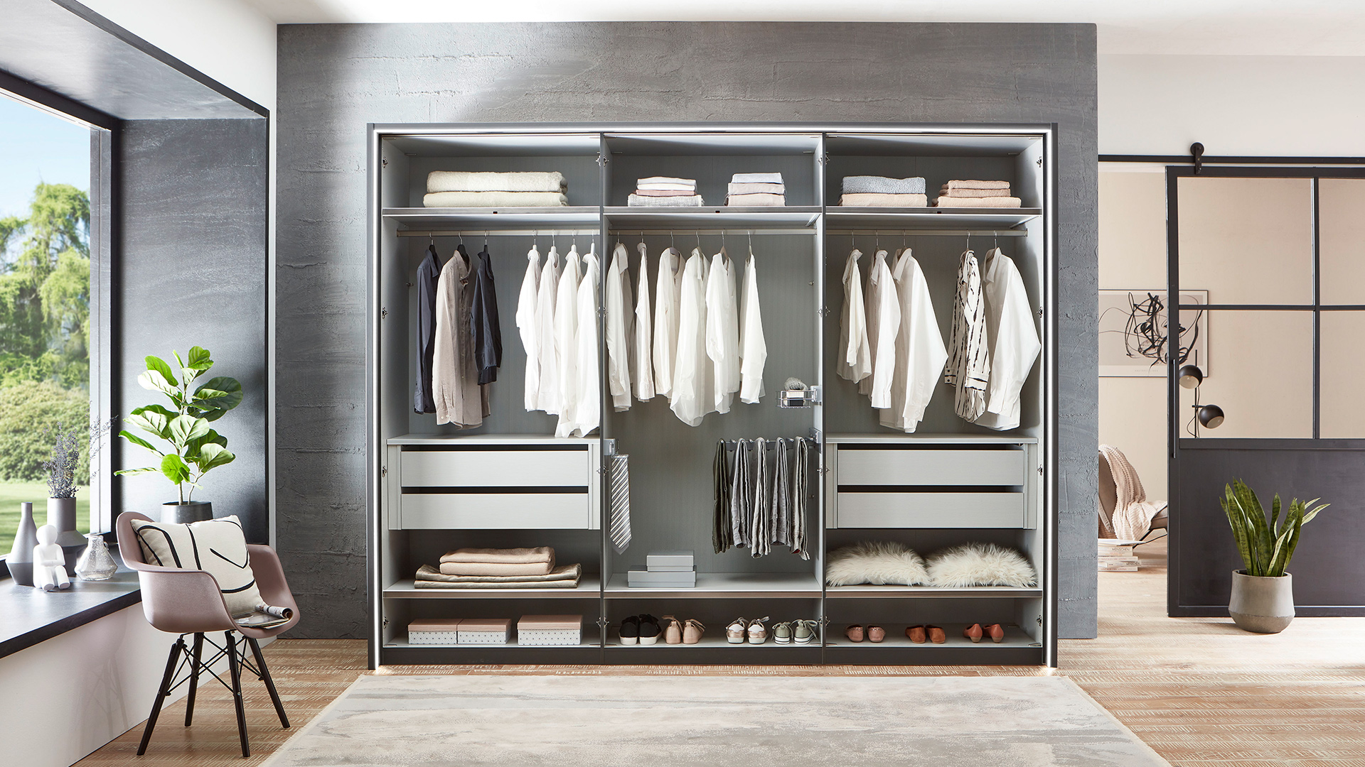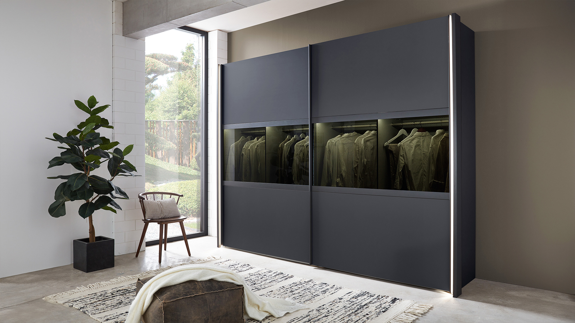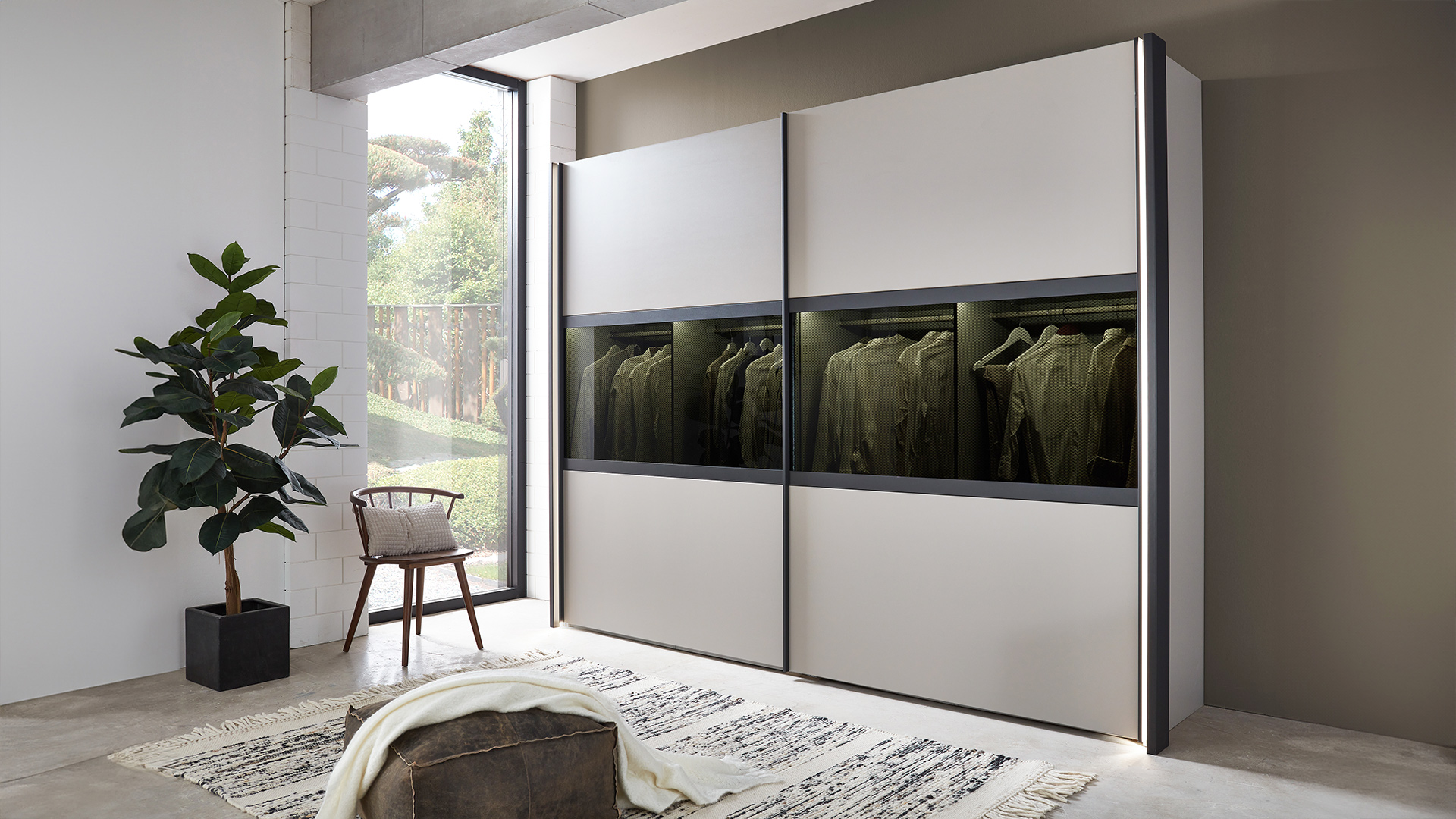 Both hinged and sliding-door wardrobes can be fitted with passe-partout frames that optionally integrate LED lighting to provide subtle, atmospheric illumination.