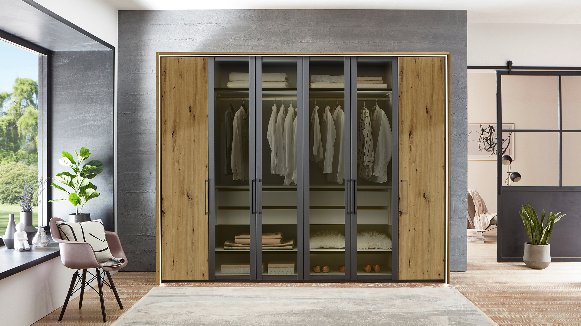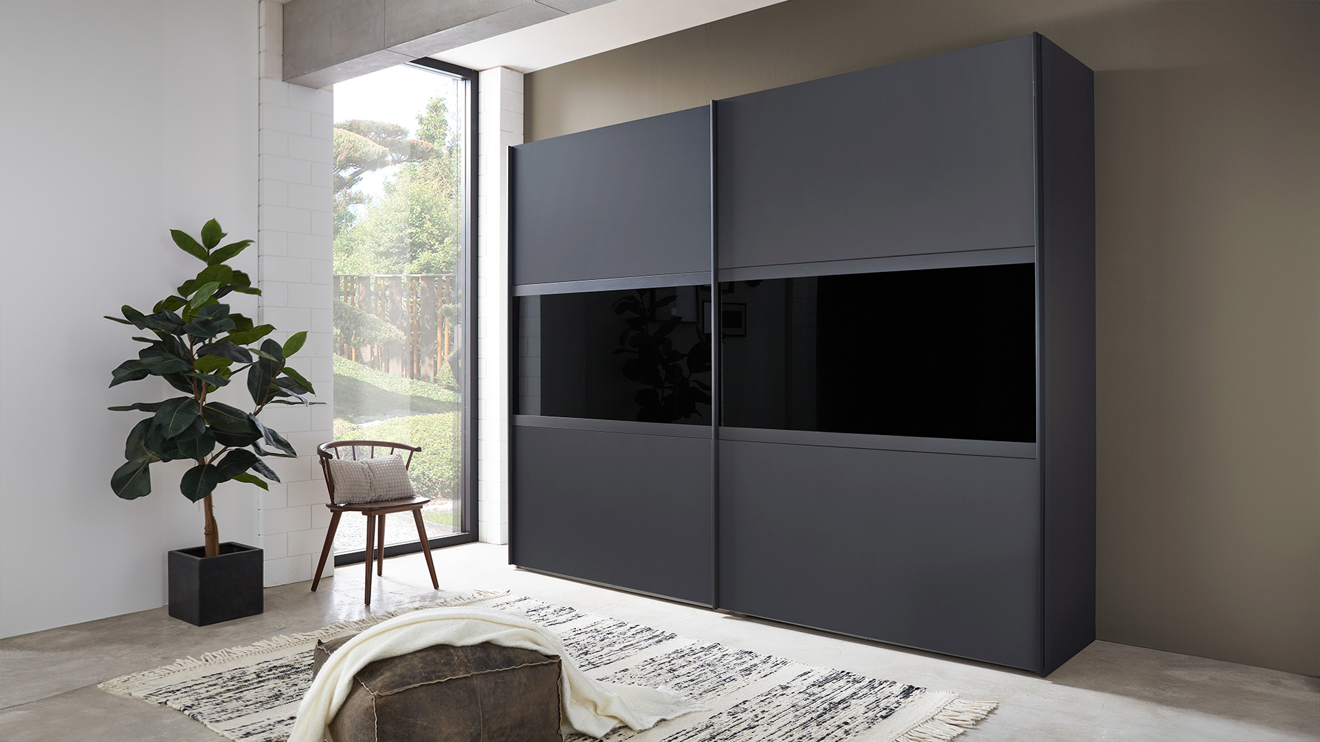 The hinged door wardrobes in the SPLIT range are available in plain décor or with sophisticated framed doors that give the furniture a special look. The fronts are not only available in classic carcase colours such as pebble grey or graphite decor, but also with exclusive glass inserts. The doors look particularly stylish thanks to the parsol grey glass, optionally with or without decorative diamonds. These glass elements give the wardrobe an elegant, almost floating look and bring light and airiness into the room.