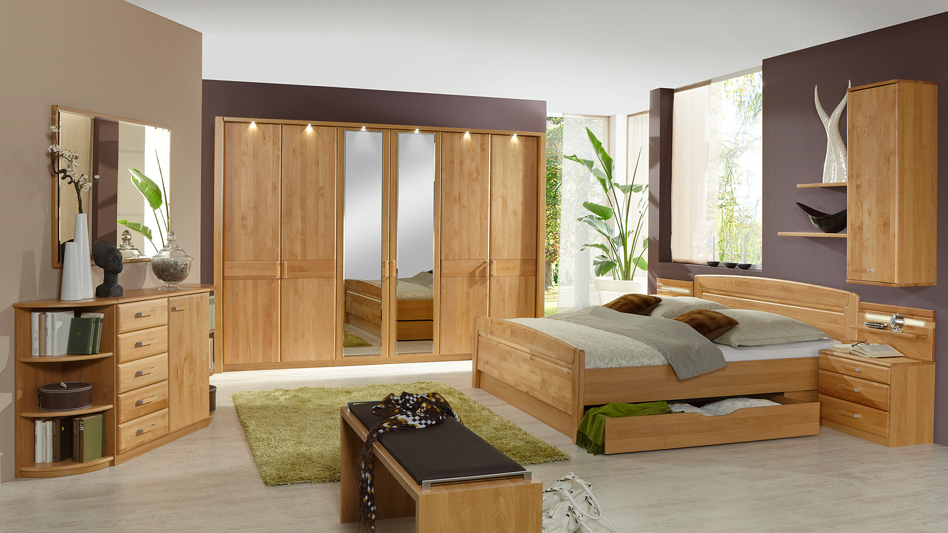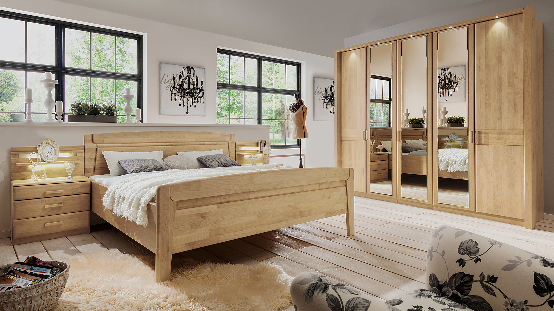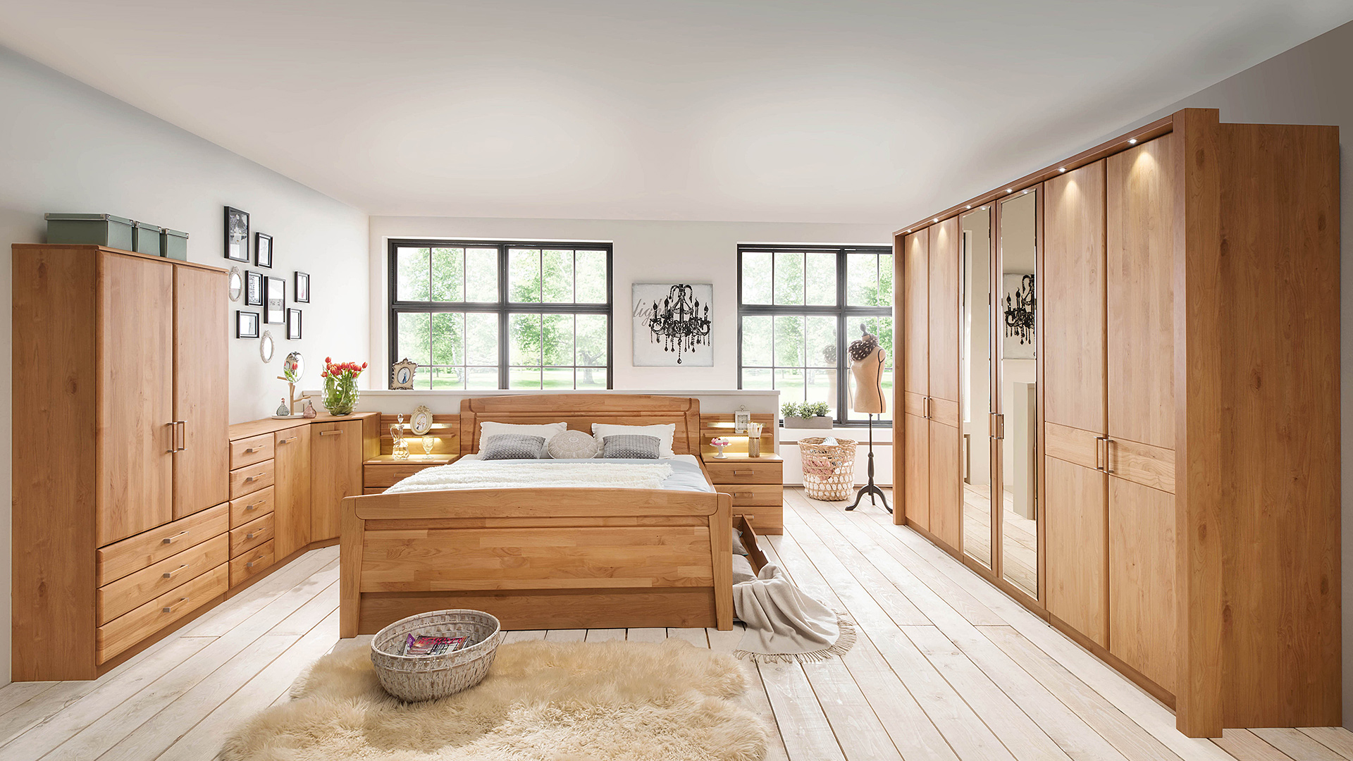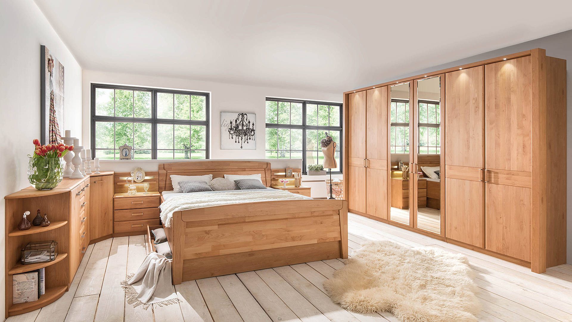 Drehtürenschränke und Funktionsschränke mit einer Kombination aus Drehtüren und Schubladen, wahlweise in Erle teilmassiv oder Birke teilmassiv. Auf Wunsch mit Parsol-Bronze-Spiegeltüren. In der Ausführung als Schwebetürenschrank besteht die Front aus einer Kombination von Massivholz und Parsol-Bronze-Spiegel-Glas. Machen Sie mit Kranzleisten, Passepartout-Rahmen und LED-Beleuchtungen sowie einem entsprechenden Innenleben noch mehr aus Ihrem Schrank.