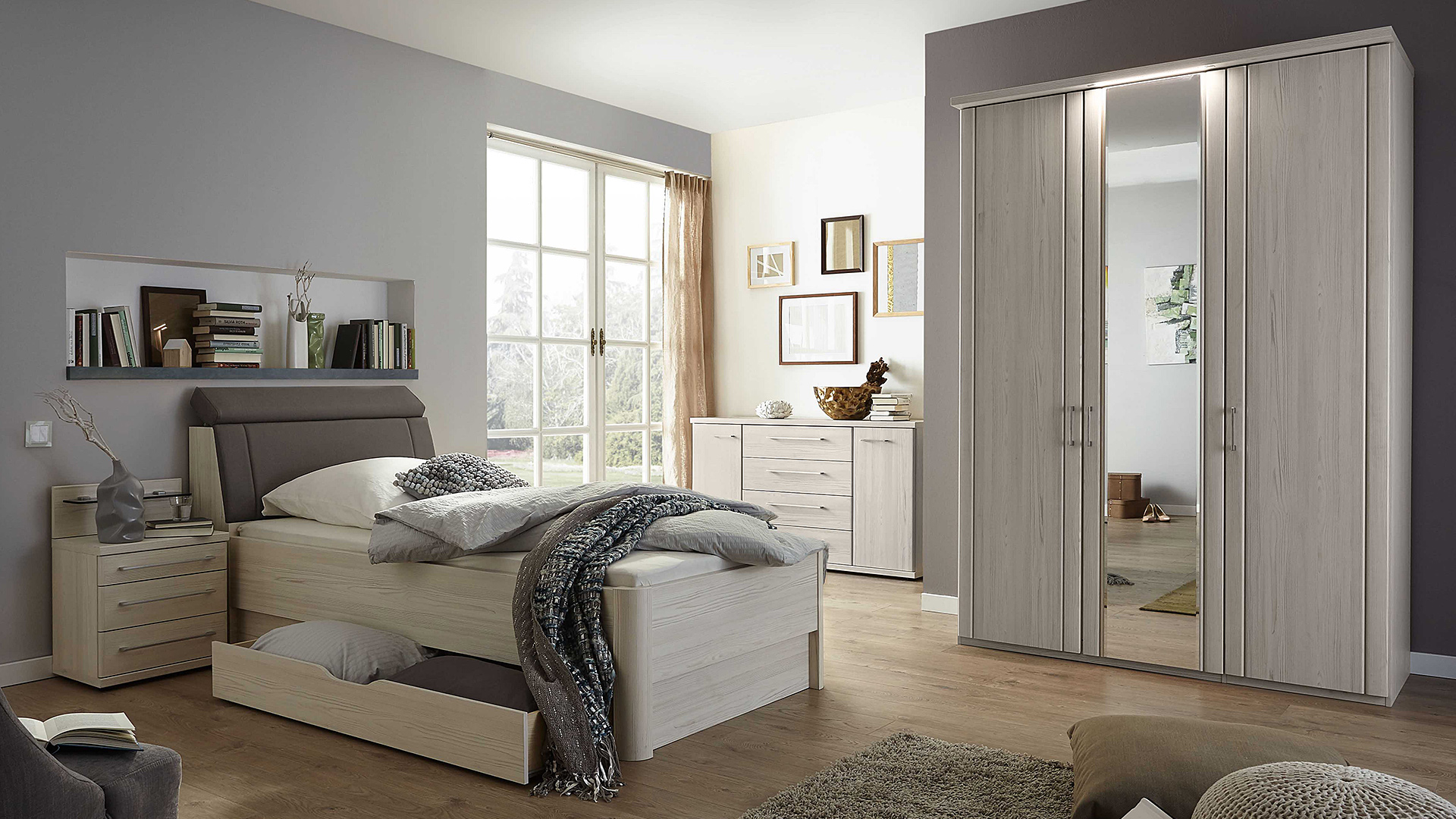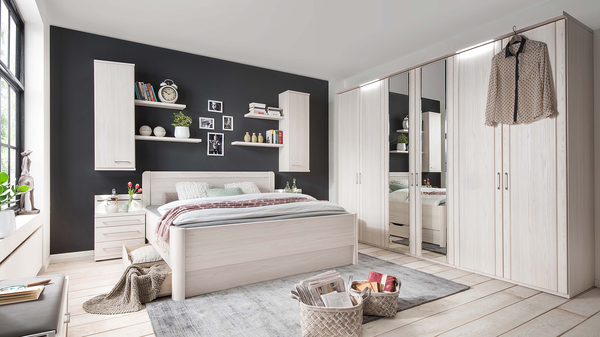 Das Komfort-Schlafraumprogramm MAINAU bietet Bequemlichkeit in seiner schönsten Form. Die helle Farbausführung Polar-Lärche-Nachbildung verleiht diesem Programm ein modernes Aussehen. Bezüglich der Schrankausführung können Sie zwischen Dreh- oder Schwebetürenschränken wählen. Die Fronten der Schränke erhalten Sie als Holztüren oder in Kombination mit Kristallspiegeltüren. Die Schrankhöhen liegen bei 197 cm bzw. bei 216 cm. Verleihen Sie Ihrem neuen Schrank einen Akzent mit einem Passepartout-Rahmen oder einer Kranzleiste (nur für Drehtürenschränke), beides wahlweise mit oder ohne Beleuchtung zu bekommen.