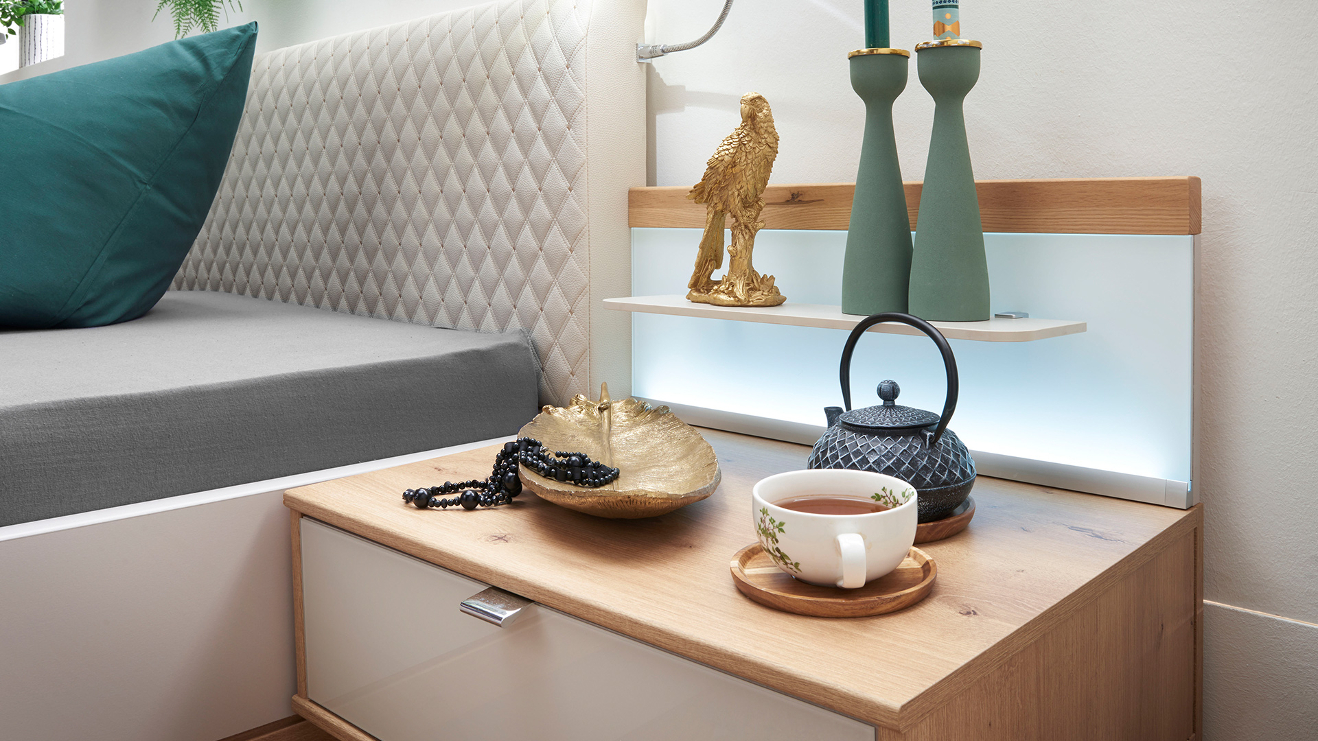 Selbstverständlich bietet BARCELONA auch Nachtschränke in vier Varianten und passende Paneele. Kommoden in verschiedenen Ausführungen, Ankleidebänke und Wandspiegel runden das Angebot perfekt ab, sodass keine Wünsche offenbleiben.