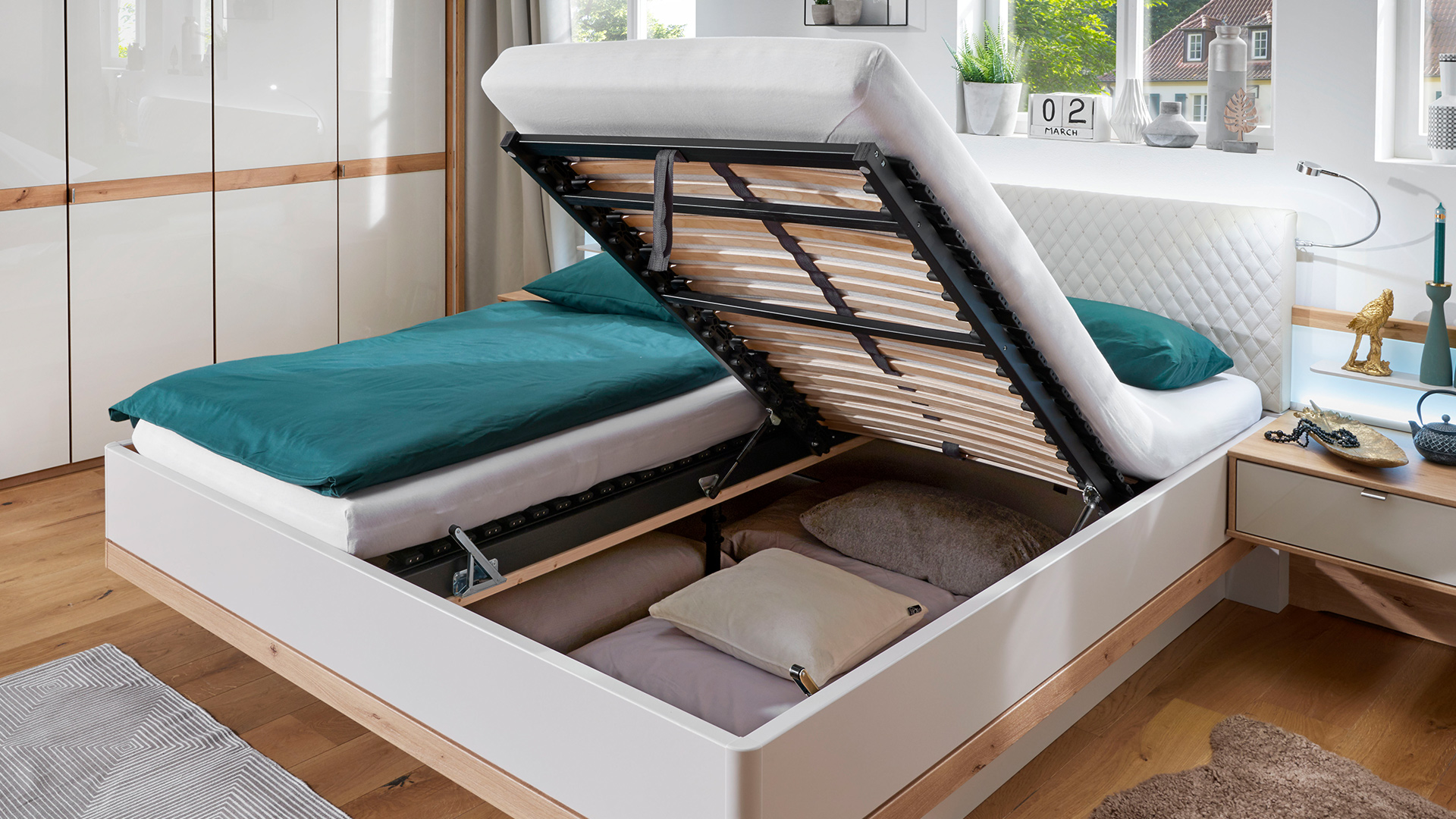 Schlafen Sie schön – das Bett mit dem gemütlichen und zugleich schicken Polster-Kopfteil mit moderner Rautensteppung lädt zum Verweilen und Träumen ein. Trotz schwebender Optik des Bettrahmens können Sie einen Unterbau-Bettkasten für mehr Stauraum unter dem Bett erhalten. Bestmöglichen Zugriff auf den Bettkasten bieten die Lattenroste mit Springaufbeschlag, die Sie optional erwerben können.