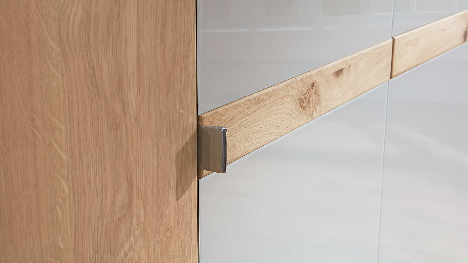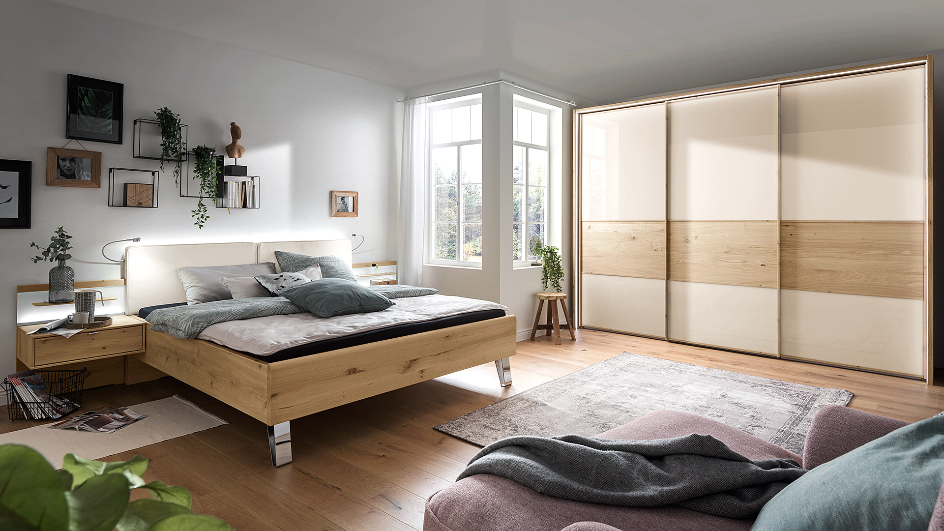 Mit BARI holen Sie sich einen echten Hingucker in Ihr Schlafzimmer. Die Holzart Bianco-Eiche teilmassiv überzeugt mit der Kombination aus Glas und modernen schiefer- oder chromfarbenen Akzenten, die sich in den Griffleisten, Griffen und Bettfüßen wiederfinden.