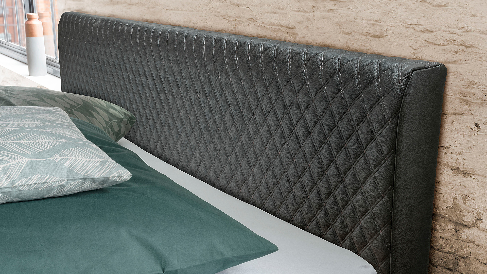 Ein Futonbett mit vierfacher Liegehöhenverstellung bildet den komfortablen Mittelpunkt Ihres Schlafzimmers. Sein anthrazitfarbiges Polsterkopfteil aus gestepptem Kunstleder (Rautensteppung) lädt zum Anlehnen ein, wenn Sie abends fernsehen oder ein Buch lesen. Alternativ können Sie Ihre Ruheoase auch mit einem zeitlos schönen Kopfteil aus Holz ausstatten. Gerne möchten wir Ihnen unser erlesenes Angebot an Kommoden und Nachtkonsolen vorstellen, das die Designserie BRÜSSEL optimal ergänzt. Unter anderem haben wir fünf Nachtschrank-Varianten (sowohl schwebende Modelle als auch Standkonsolen) sowie Kommoden in fünf Breiten und vier Höhen im Programm. Eine praktische Ankleidebank mit Sitzauflage aus Kunstleder und zwei Wandspiegel komplettieren Ihre neue Schlafzimmereinrichtung.