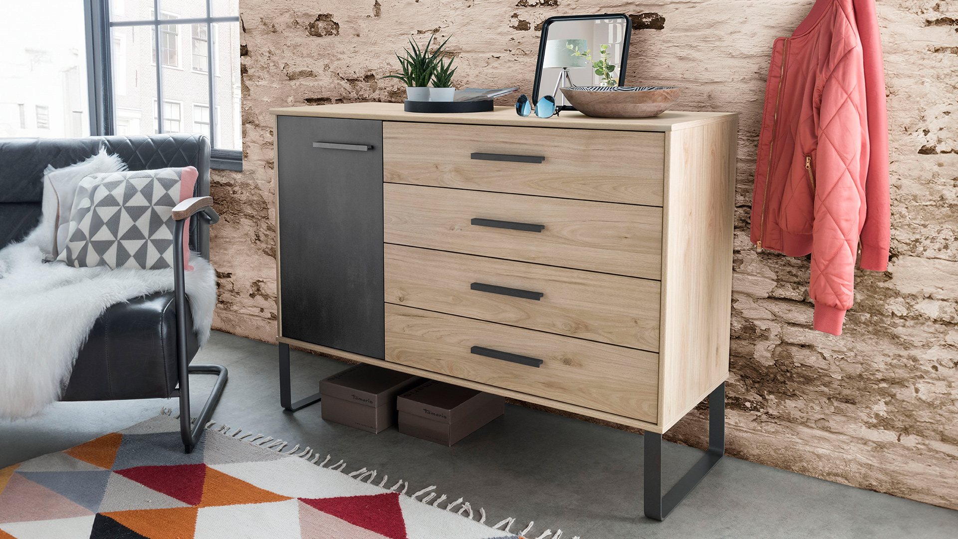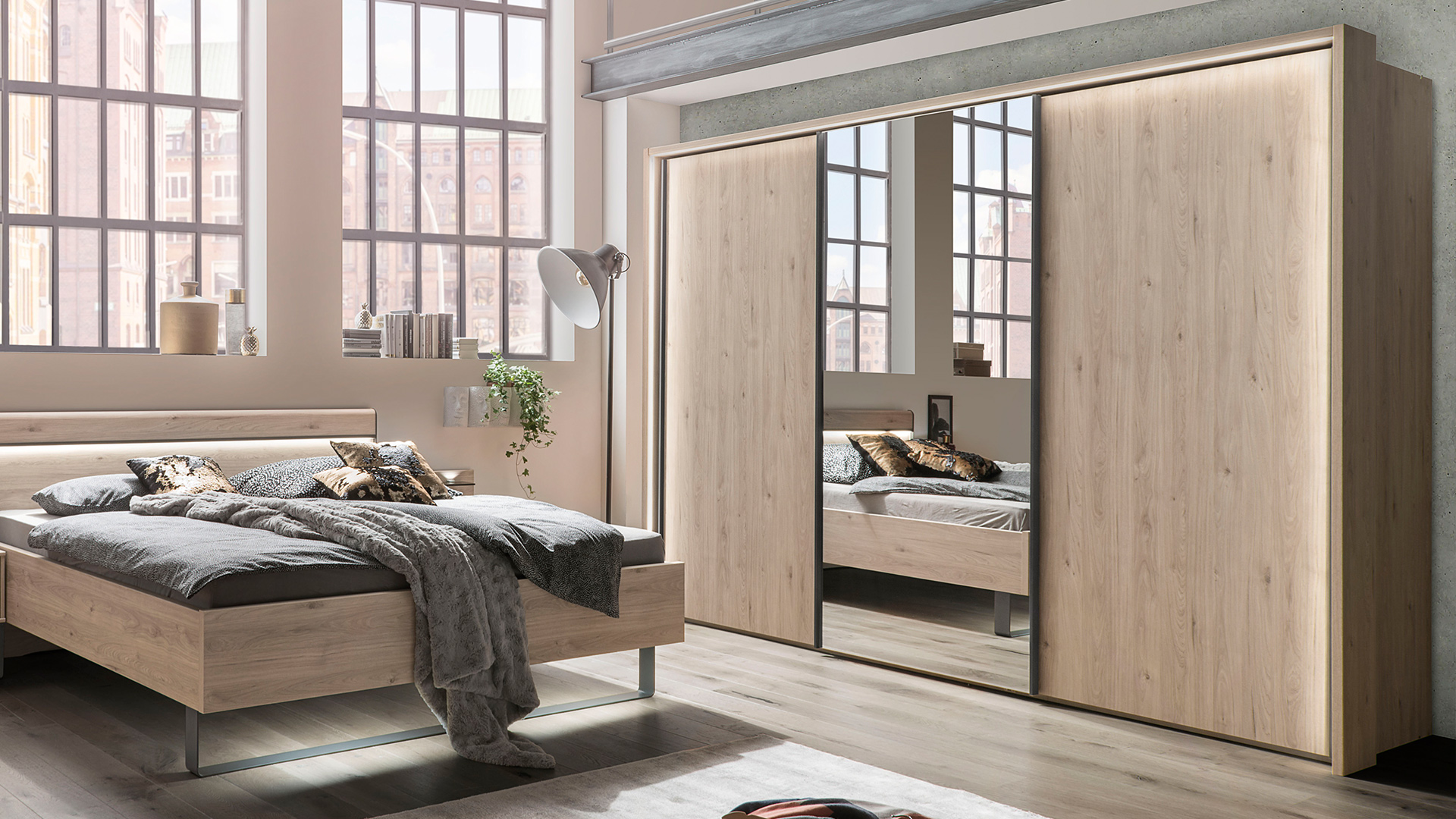 Modern, stylisch und ein wahres Stauraumwunder: Unsere Möbelserie BRÜSSEL vereint zeitgemäßes Design mit hoher Funktionalität. Die natürliche Optik der hochwertigen Qualitätsmöbel in schlichter Steineiche-Nachbildung verwandelt Ihr Schlafzimmer dank der Absetzungen, Griffe und Griffleisten in eleganter Schiefer-Nachbildung in ein modernes Loft.