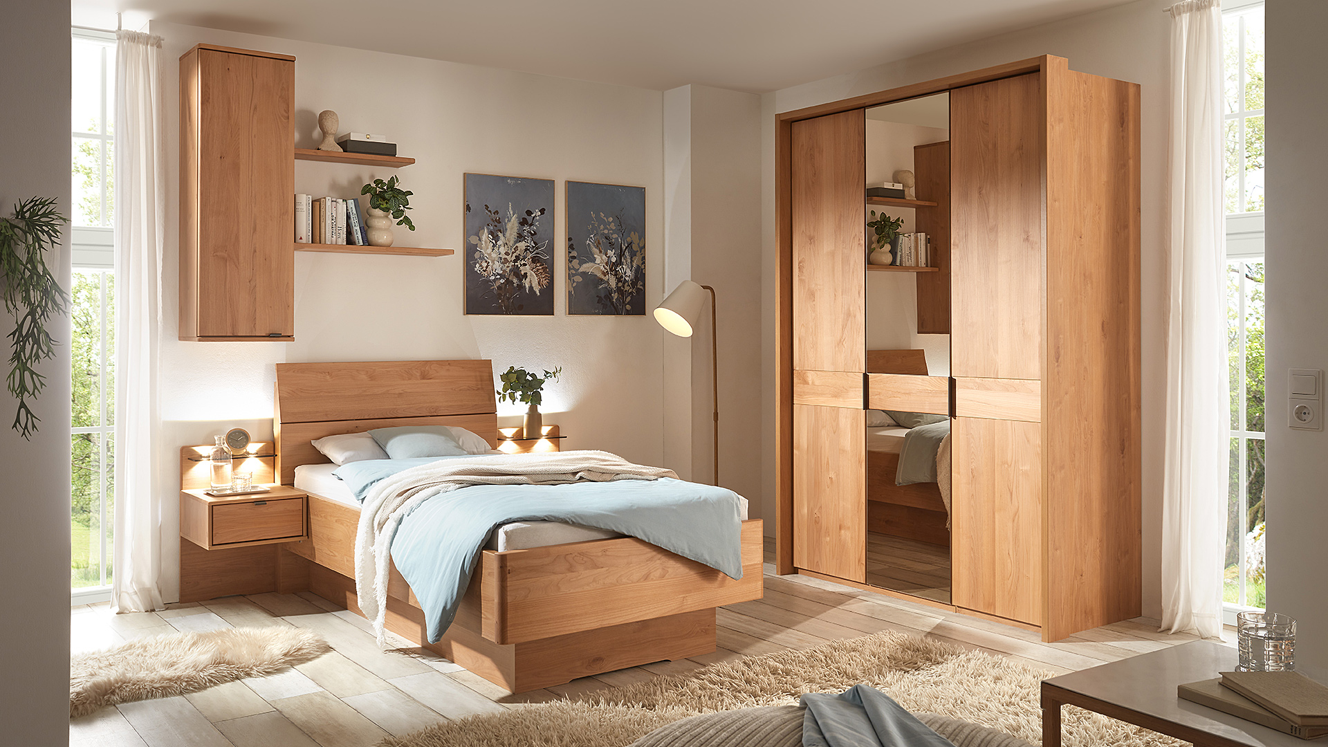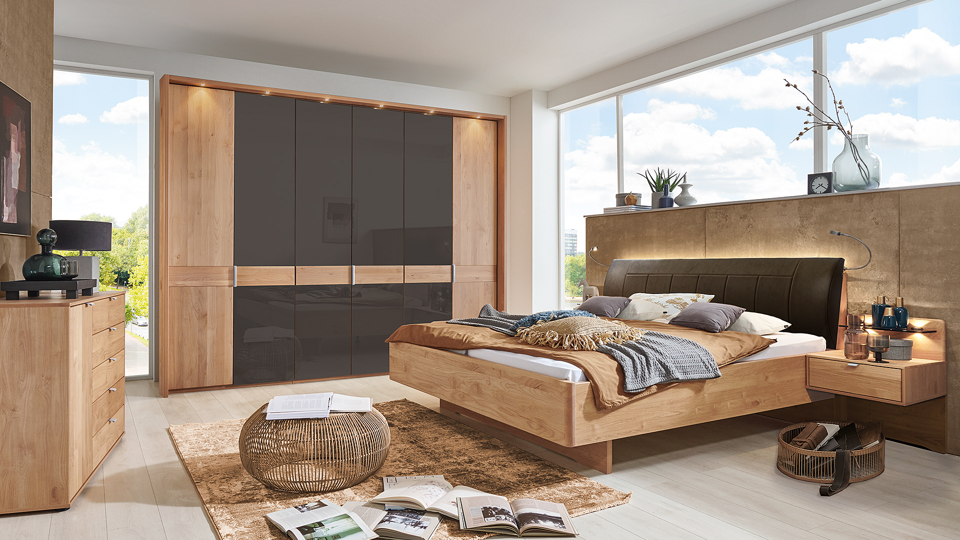 Das Modell CARDIFF besticht durch seine Kombination aus hochwertigem teilmassiven Holz und modernen Designelementen. Ob Erle, Eiche oder Bianco-Eiche – für jeden Geschmack ist etwas dabei. Die natürlichen Holzstrukturen verleihen Ihrem Schlafzimmer eine warme und zugleich moderne Atmosphäre.