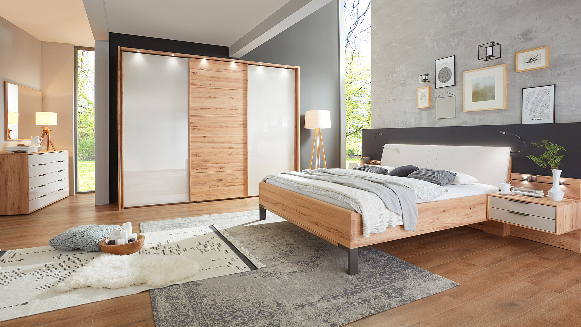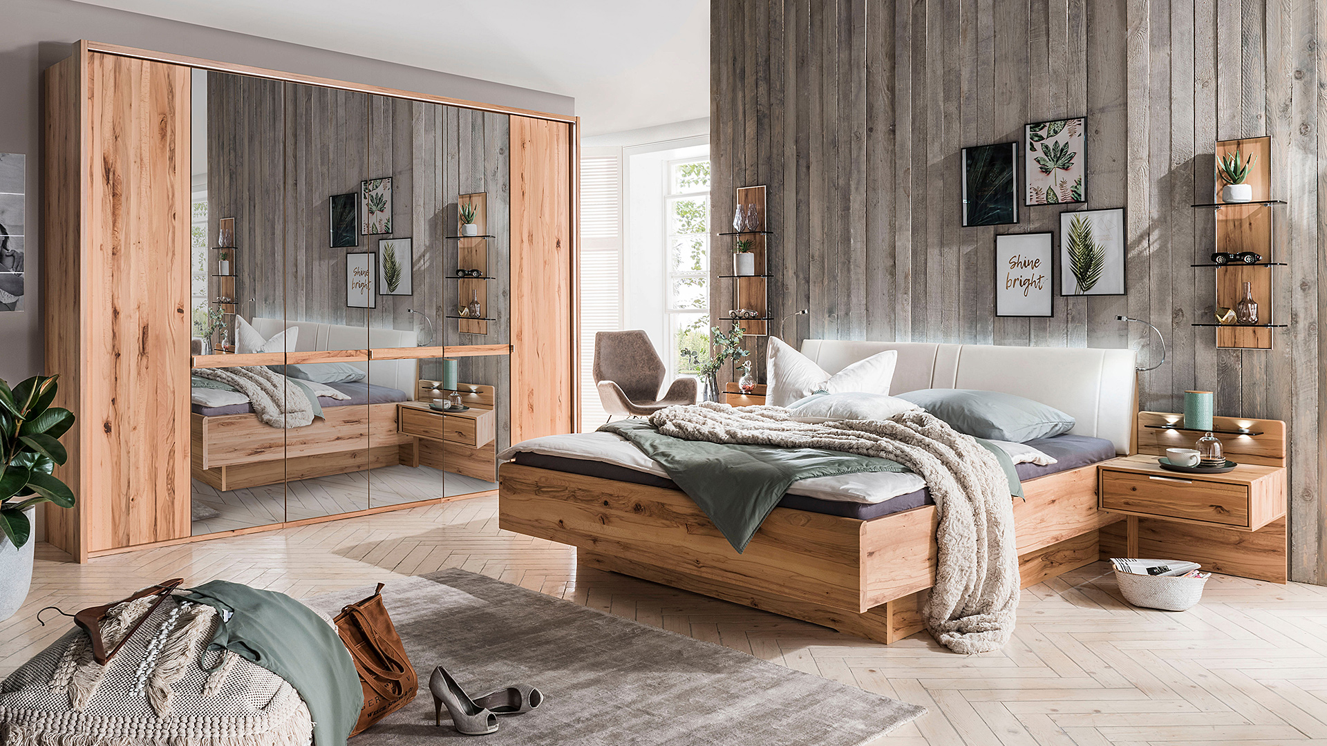 Modern, natürlich und robust: Die aus der neuen Holzart Astkernbuche gefertigte Möbelserie LIVORNO verwandelt Ihr Schlafzimmer dank dunkler und heller Holznuancen in einen Rückzugsort für Naturliebhaber. Neben den variantenreichen Futonbetten sind die Drehtüren- und Schwebeschränke in zwei verschiedenfarbigen Korpus- und Frontausführungen samt Glasfront oder Kristallspiegel erhältlich und beweisen aufgrund einer großen Beimöbelauswahl, bestehend aus Nachtschränken, Kommoden und Regalen, optimale Kombinationsvielfalt.