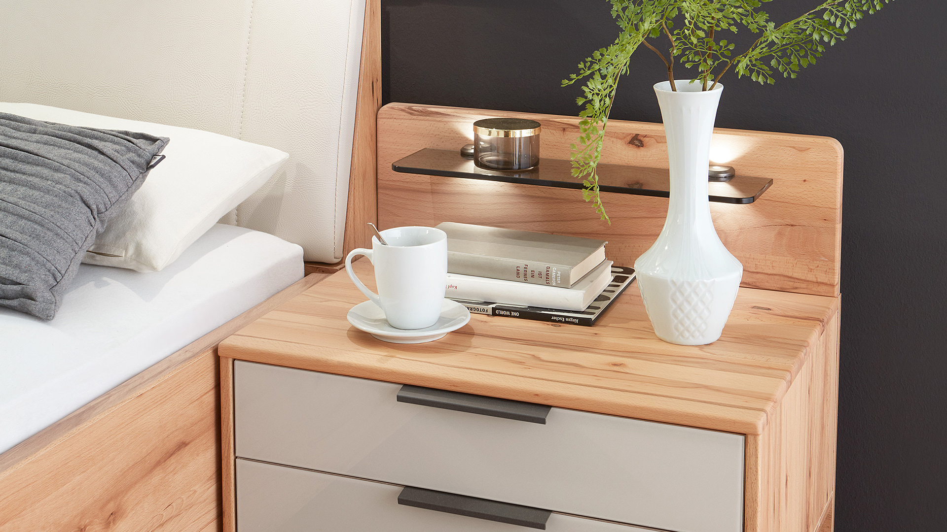 Abgestimmt auf die LIVORNO Futonbettenvielfalt erweisen sich separate Zusatzelemente wie funktionale Lattenroste mit Springauf-Beschlag im 2er-Set, großzügige Unterbaubettkästen für Futonbetten mit Quersockel oder flexible LED-Leuchten zur Befestigung am Kopfteil als praktische Ergänzung. Daneben erhalten Sie variable Beimöbel wie schwebende oder stehende Nachtschränke mit einem bis zweieinhalb Auszügen in den Ausführungen Massivholz oder Glas Champagner sowie Nachtschrank-Paneele mit Rauchglasboden und stimmungsvoller LED-Beleuchtung. Ihr gemütliches Schlafambiente komplettieren Sie dank der großen LIVORNO Beimöbelauswahl in Form von cleveren Kommodenvarianten, wahlweise mit Türen oder Schubkästen, sowie Regal-Paneelen als zusätzliche Ablagemöglichkeit.