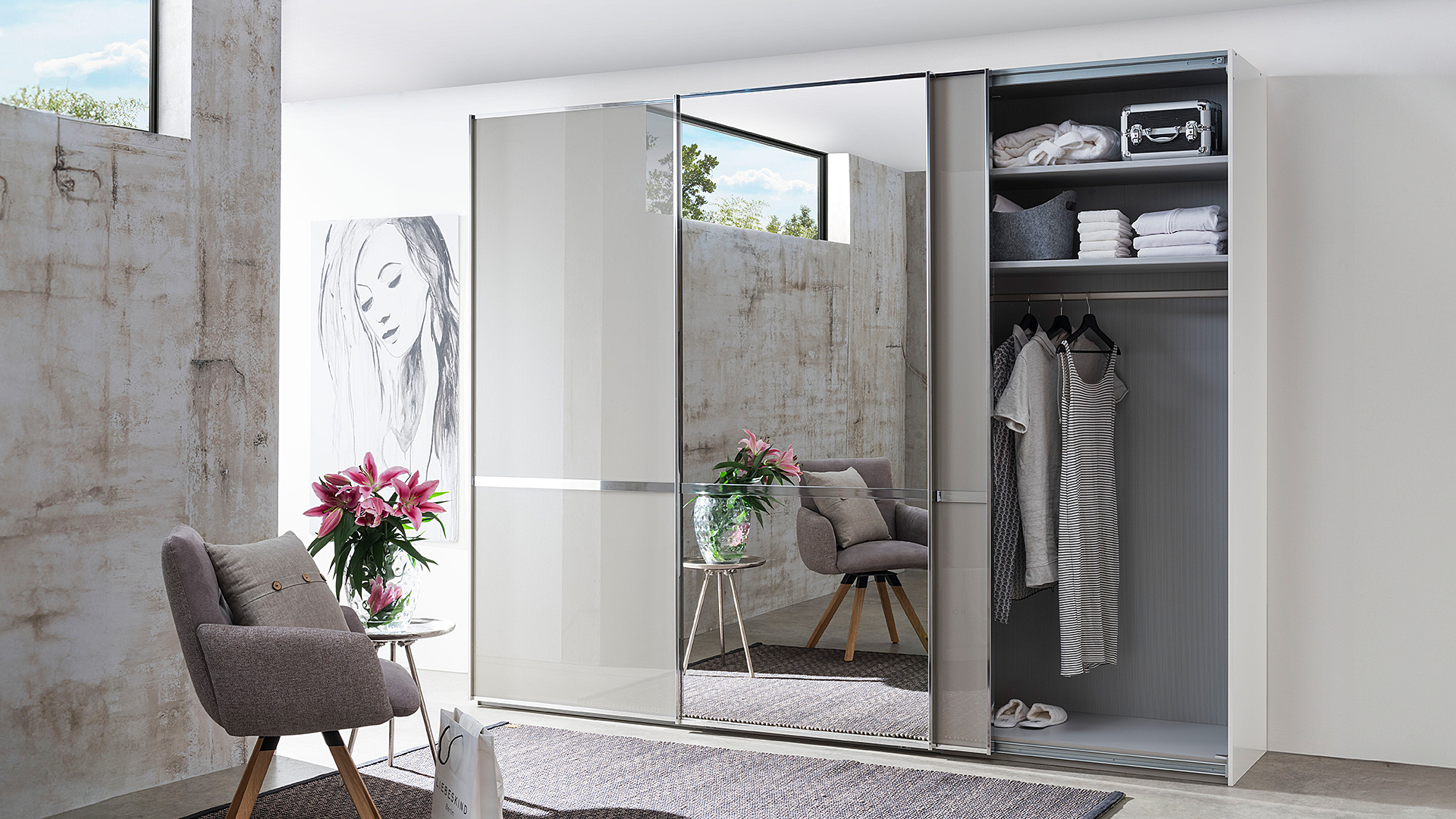 Ob Schwebetürenschränke, Drehtürenschränke oder Funktionsschränke - bei der Möbelserie MONTREAL finden Sie exakt das Modell, welches Ihren Vorstellungen entspricht. Wählen Sie einen Schwebetüren- oder Drehtürenschrank mit einer Komplettfront in Glas Kieselgrau sowie einer Kombination mit Kristallspiegeltüren oder profitieren Sie bei einem Funktionsschrank in Glas Kieselgrau mit vier bis fünf Auszügen von dessen Systemfunktionalität. Im Schrankinneren findet sich, ergänzend zur Standardausführung mit zwei Einlegeböden und einer Kleiderstange, die Möglichkeit, vielseitiges Schrankzubehör wie stapelbare Schubkasten-Einsätze, Hosenhalter, Krawattenauszüge und LED-Lichtblenden für Einlegeböden anzubringen. Griffe, Griffleisten und Querriegel-Leisten sind bei sämtlichen Modellen in den Varianten Chrom oder Schwarz erhältlich.