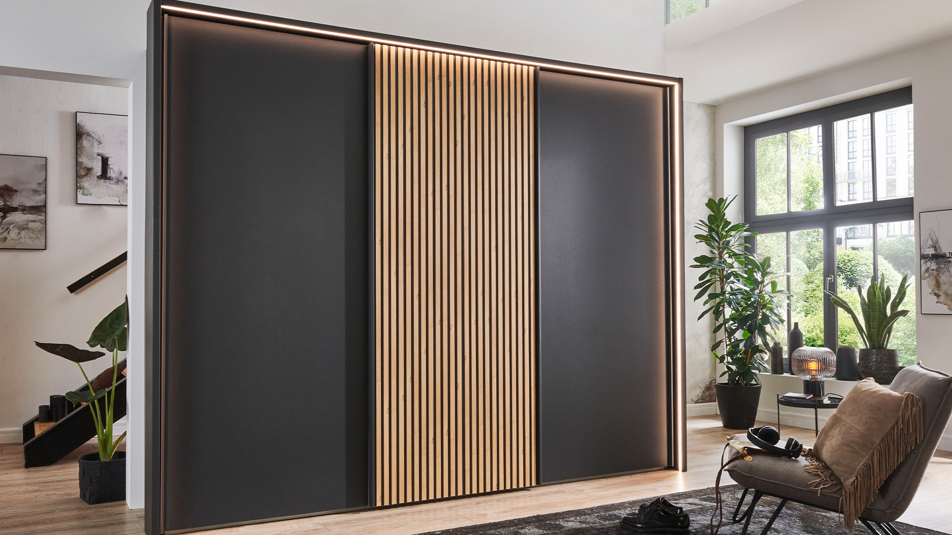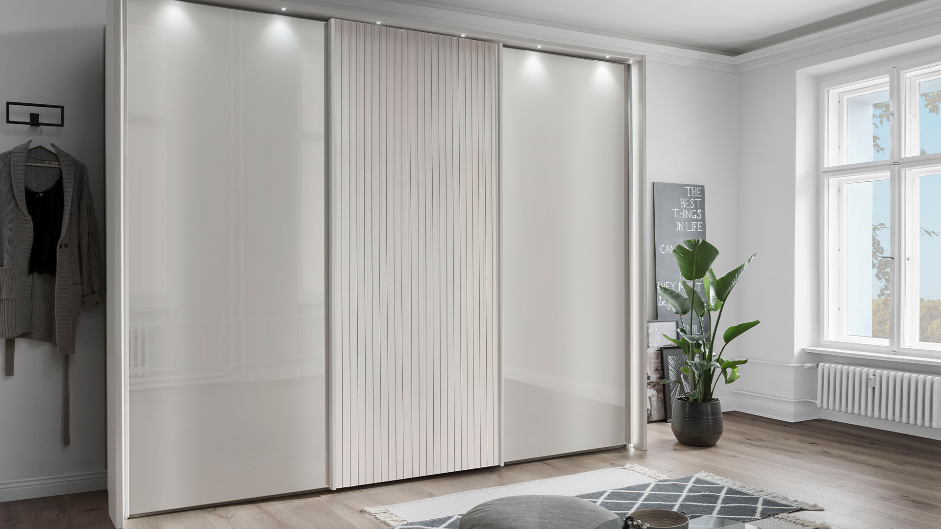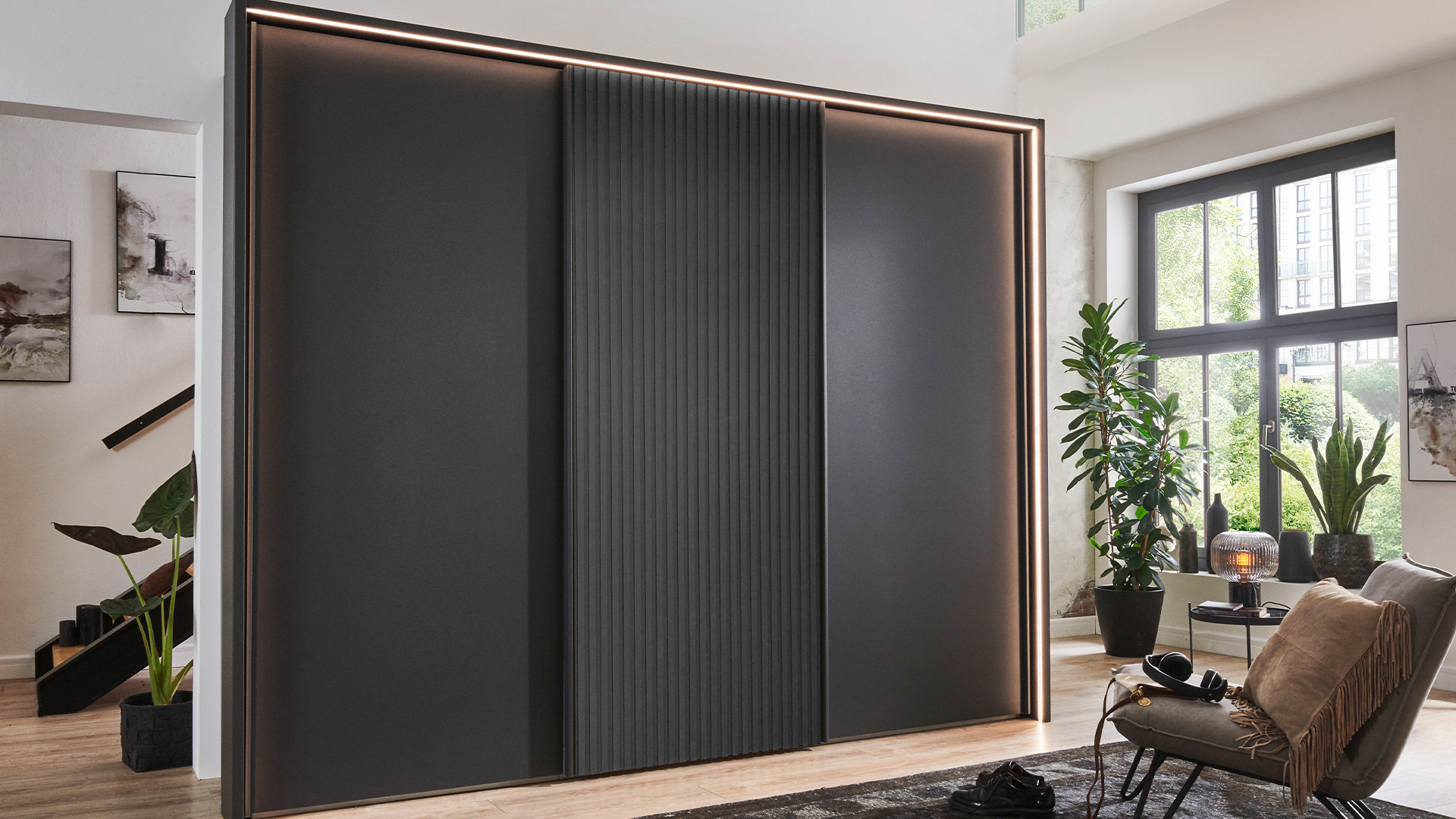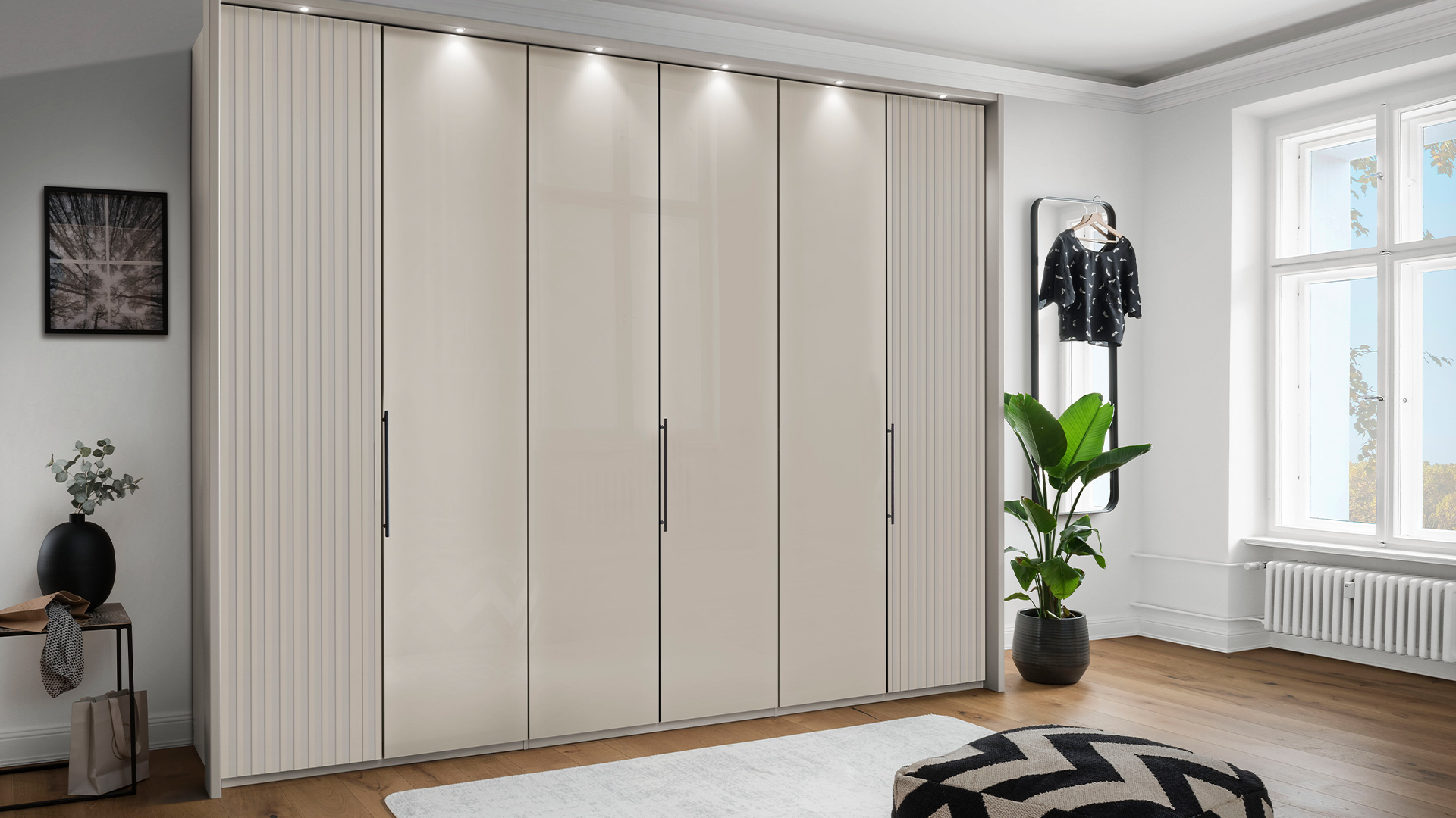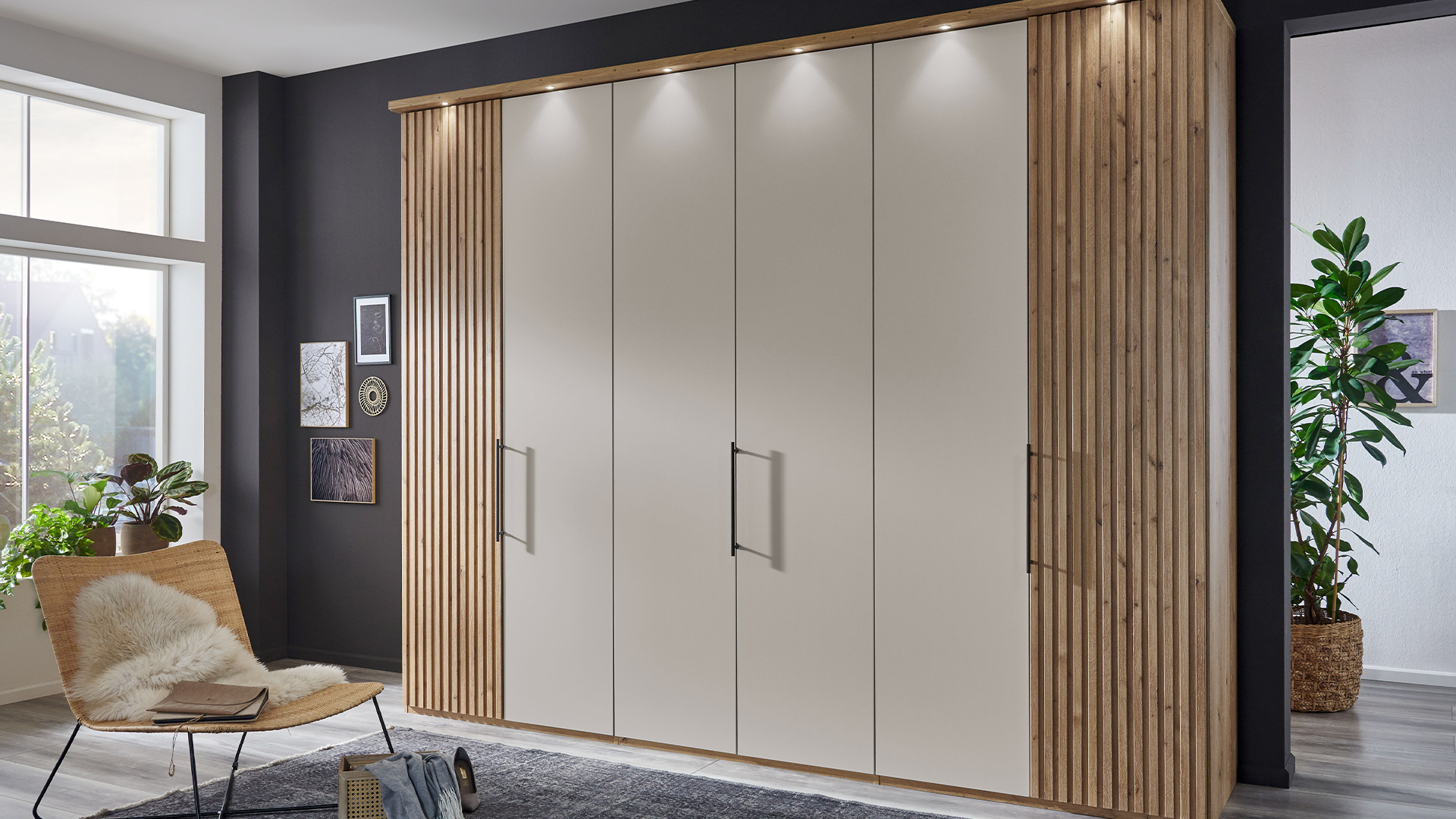 Die Drehtürenschränke der NEVADA-Serie überzeugen durch ihr stilvolles Design und die große Auswahl an Größen – von kompakten ein- bis zu beeindruckenden acht-türigen Schränken. Die Schwebetürenschränke sind eine elegante und raumsparende Lösung. Sie sind in verschiedenen Breiten – von 150 cm bis 400 cm – erhältlich. Die Schränke sind in einer breiten Palette von Korpus- und Frontausführungen erhältlich, darunter moderne Dekorfarben und elegante Glasoptionen. Für einen besonderen Hingucker sorgen die stilsicheren Lamellen, die passend im Korpus-Farbton oder als Akzent in Bianco-Eiche-Nachbildung gewählt werden können. Durch die optional erhältlichen Kranzleisten und Passepartout-Rahmen mit LED-Beleuchtung wird jeder Schrank zum Blickfang.