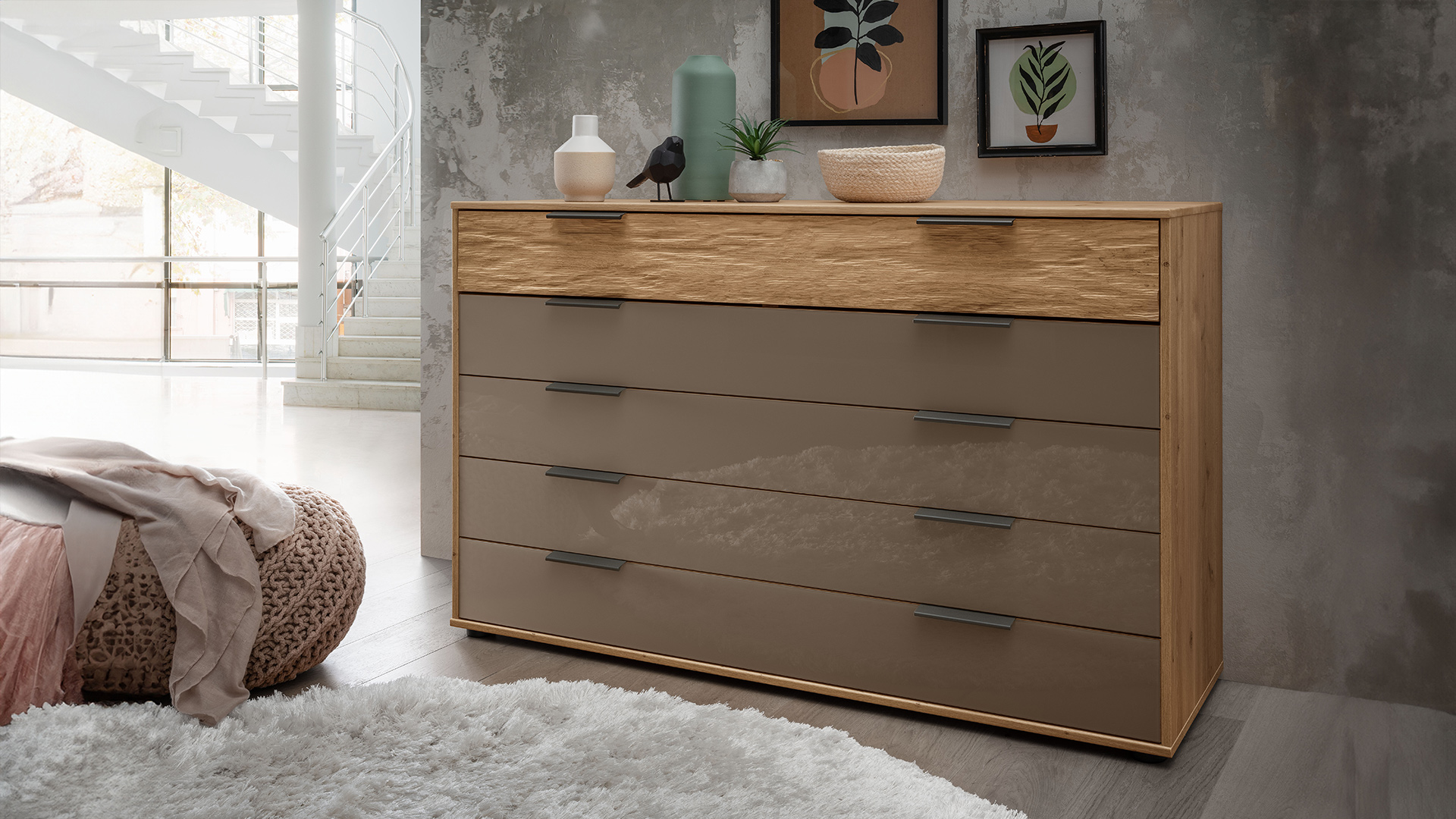 Das Schlafzimmerprogramm VANCOUVER kombiniert edle Materialien mit einem modernen, klaren Design. Die vielseitigen Gestaltungsmöglichkeiten machen es zur perfekten Wahl für anspruchsvolle Wohnräume, in denen Funktionalität und Ästhetik harmonisch aufeinandertreffen. Die Fronten der Schränke sind mit edlen Gläsern in Havanna oder Champagner erhältlich. Diese Glaselemente sorgen für einen eleganten Kontrast zu den massiven Holzelementen und verleihen den Schränken ein luxuriöses Erscheinungsbild. Optional können Sie auch Kristallspiegeltüren integrieren, die das Raumgefühl erweitern und zusätzliche Helligkeit bringen.