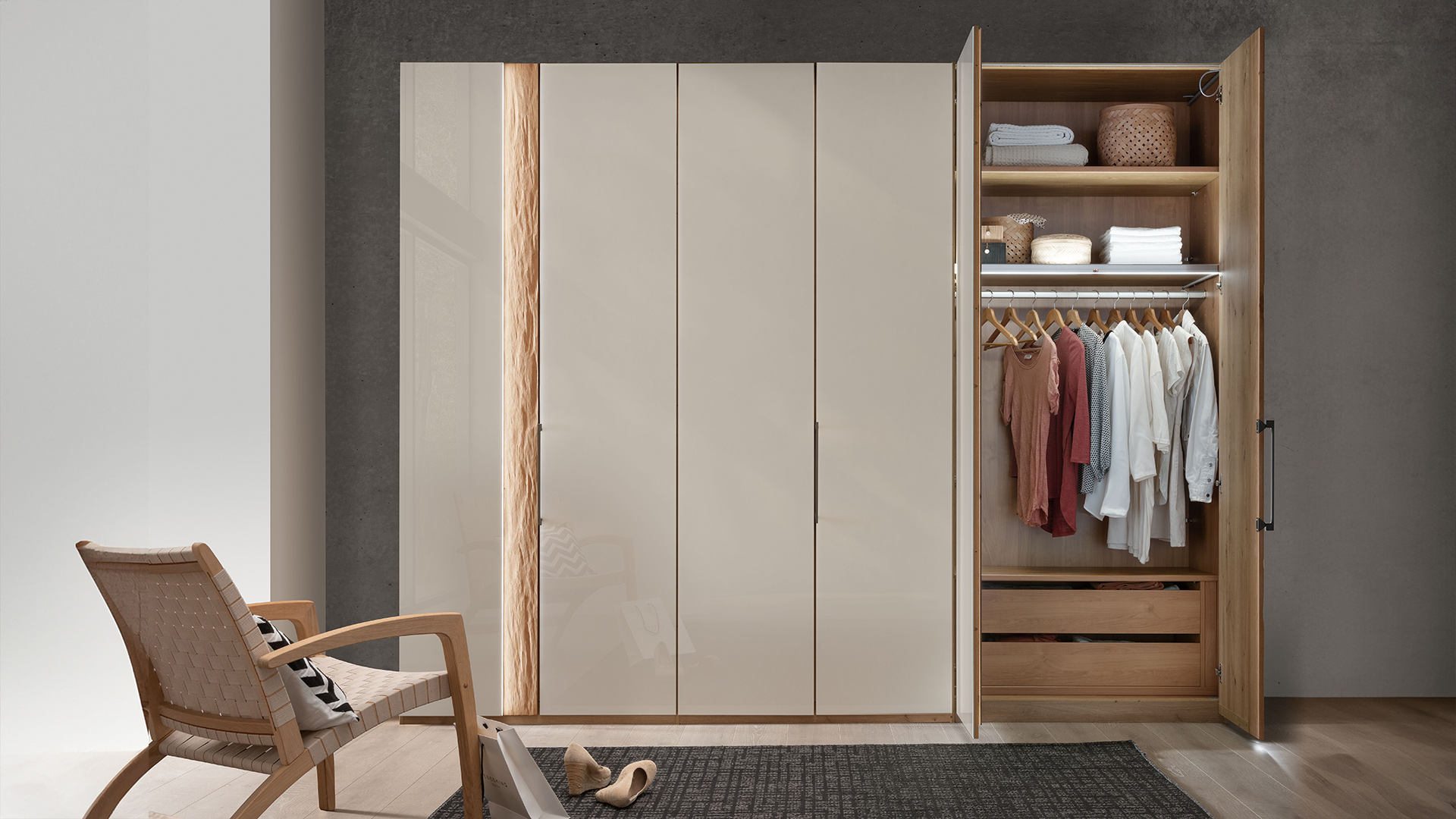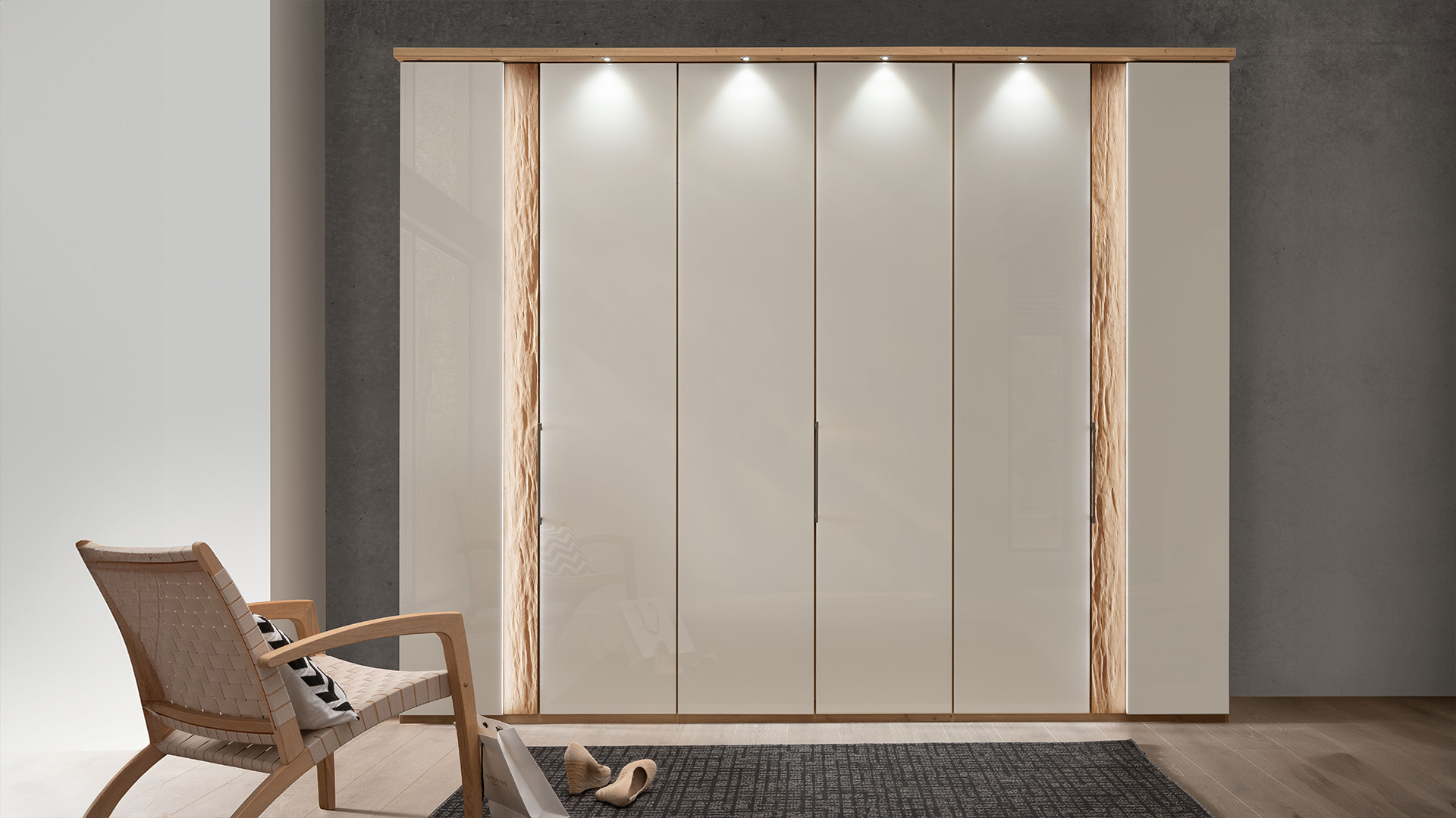 Die Drehtürenschränke der VANCOUVER-Serie sind nicht nur funktional, sondern auch ein echter Blickfang. Sie sind in Breiten von 50 cm bis 400 cm erhältlich und bieten eine Vielzahl an Kombinationsmöglichkeiten. Besonderes Augenmerk gilt den hochwertigen teilmassiven Elementen und den stilvollen Designaußentüren, die dieses Programm einzigartig machen. Die Designaußentüren mit Aufleistungen in Riffholz massiv schaffen eine natürliche, lebendige Optik. Diese Außentüren können mit Glastüren kombiniert werden, was den Schränken eine edle und zugleich moderne Ausstrahlung verleiht.