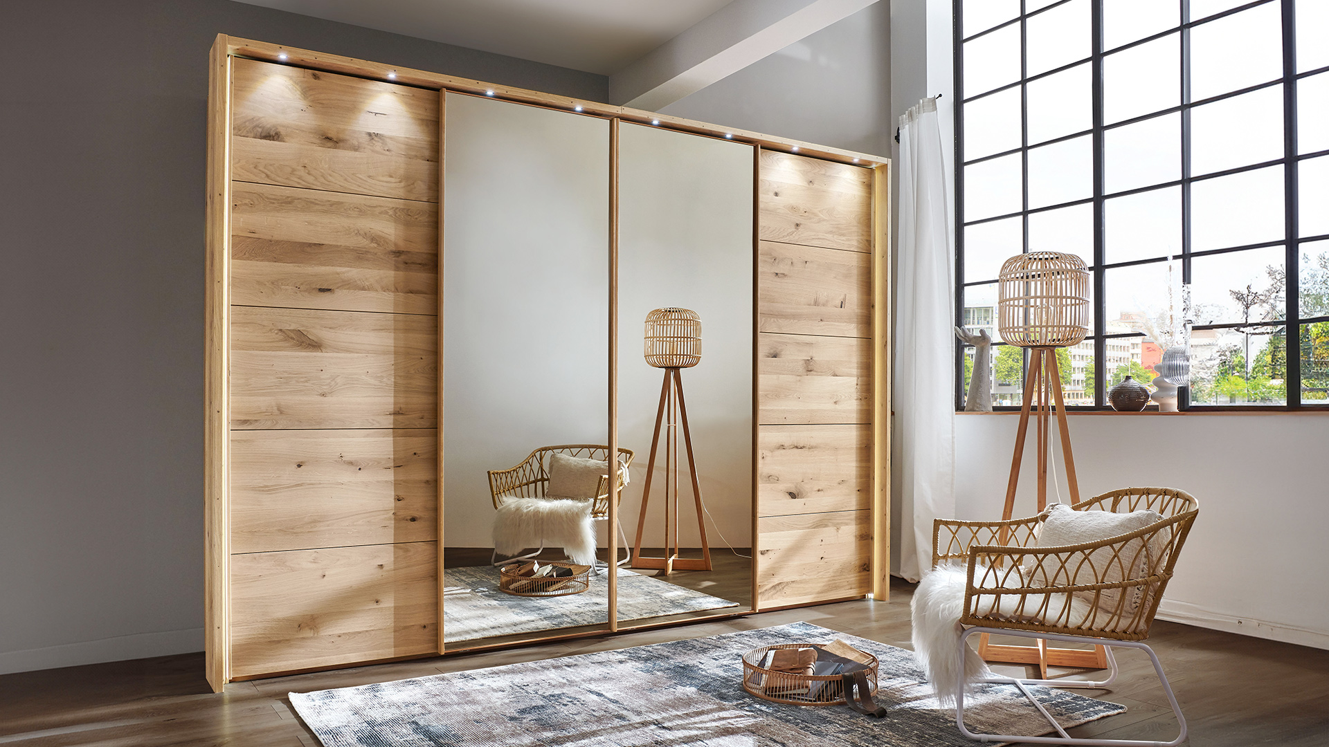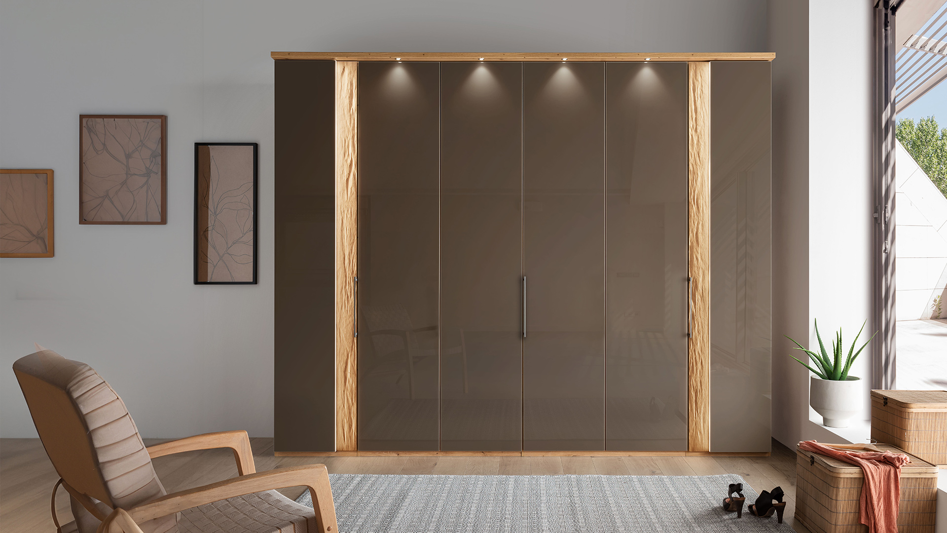 Die Schwebetürenschränke des VANCOUVER-Programms vereinen Platzersparnis und stilvolle Optik. Sie sind in verschiedenen Breiten von 150 cm bis 400 cm erhältlich. Die Fronten kombinieren Glas in Havanna oder Champagner mit massiven Türen in 5-Felder-Optik, wodurch ein modernes, harmonisches Gesamtbild entsteht.